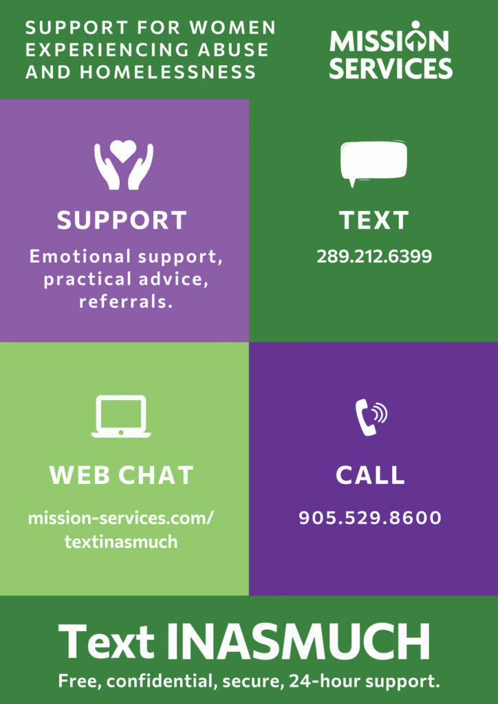In addition to our 24-hour crisis line, Text Inasmuch provides secure, text- and web-based support for women and non-binary people in Hamilton experiencing abuse or homelessness. Our client advocates are available to provide emotional support, practical advice, and referrals.